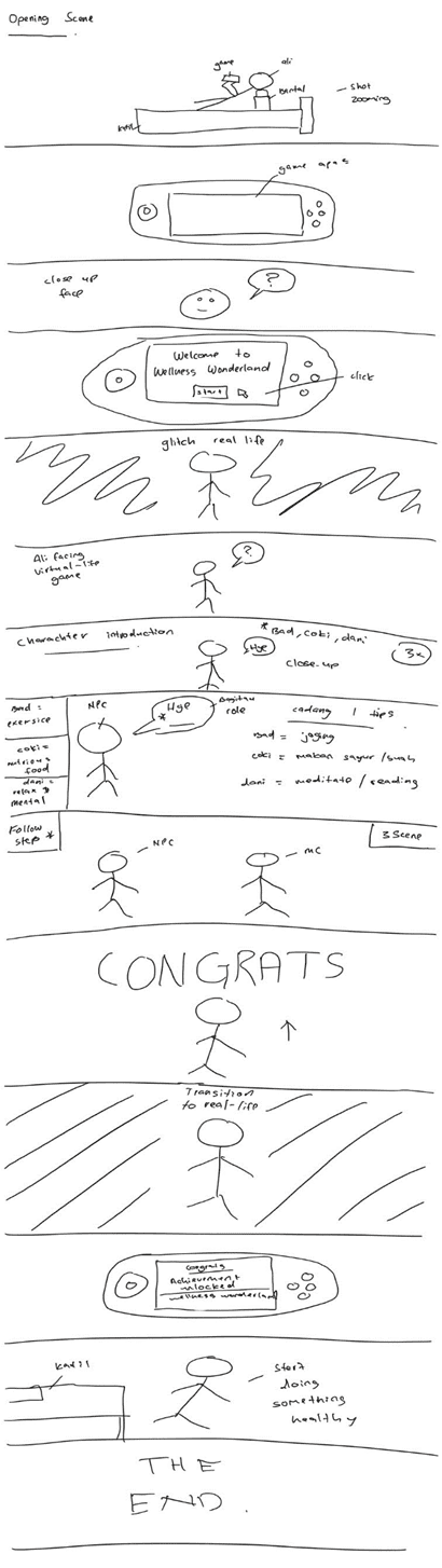 A young character named Ali is always seen munching on snacks and playing video games. He's unaware of the impact his habits have on his health. One day, he discovers a mysterious map leading to a 'Wellness Wonderland.' Curious, Ali embarks on an adventure following the map. Along the way, he encounters colorful characters like David, Bad, Dani, and Dmo, each representing different aspects of a healthy lifestyle. Bad introduces Ali to fun exercises, Dmo teaches him about nutritious foods, and Dani shows him the importance of relaxation and mental well-being. After finishing the video game, Ali began to realize to change his lifestyle to a healthy life.